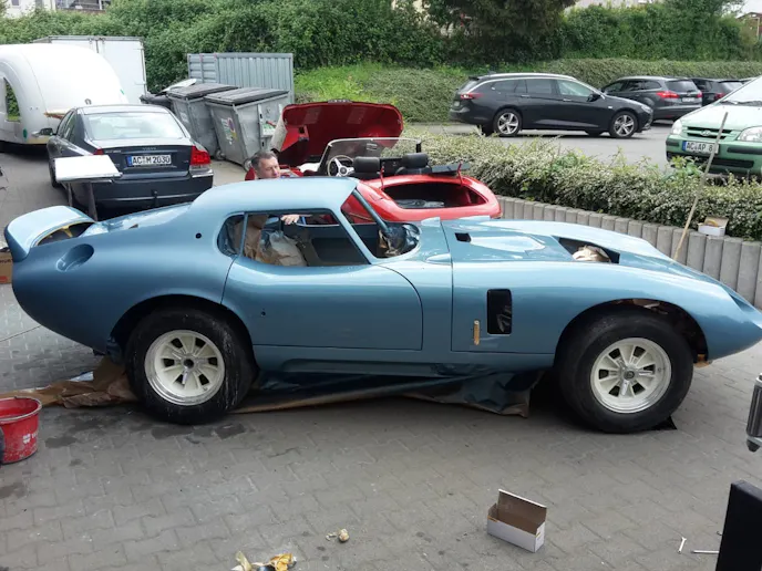 The duplicate appearing at the Nürburgring is actually the second Daytona Coupe produced — and the first built by Carrozzeria Gransport. Brock recalls, “Being hand-built, (the Coupes) tended to vary slightly in form. The solution to getting more built after we’d done the first one at Shelby’s shop in Venice, California, was to have a small carrozzeria in Modena build the next five bodies.”