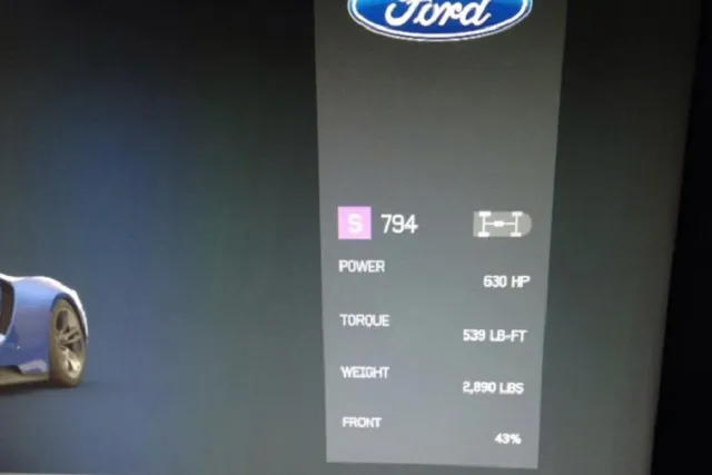 First let’s get to the good stuff. A tipster sent the above photo into Motor Authority of a purported Forza 6 screenshot of the star car, the Ford GT. And over in the specifications column we see its horsepower listed at 630, with 539 lb-ft of torque and a curb weight of 2,890 lbs with a 43/57 weight distribution.