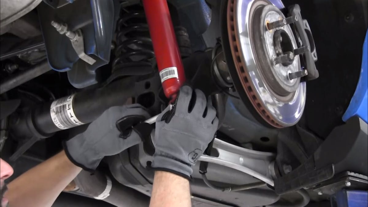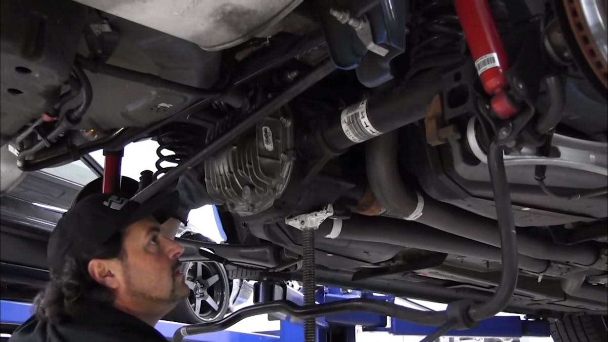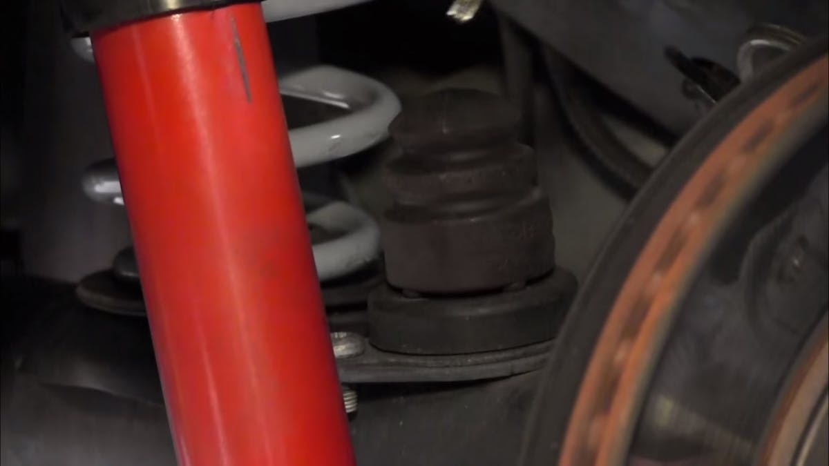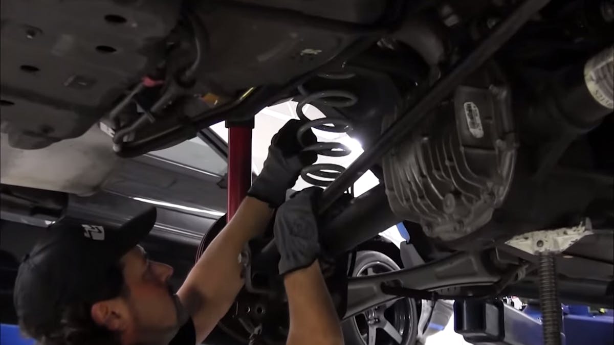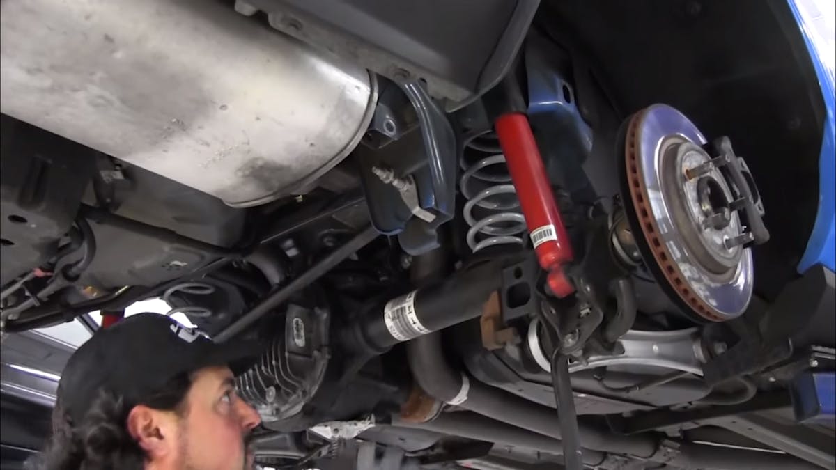 “This modification not only lowers the rear by one inch, but improves appearance by reducing the excessive rake of stock ride height,” the narrator explains. “We will also be replacing the factory bump stops with the lower Maximum Motorsports bump stop kit.”