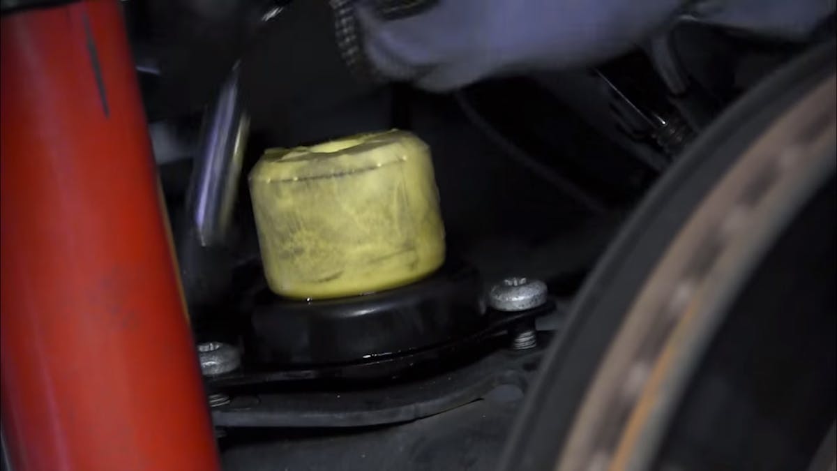 Now that you have the new springs in, remove the stock, rear passenger side stock bump stop with the T40 Torx bit. With the bump stop removed, take the stock rubber bump stop out of the sheetmetal bracket and force the Maximum Motorsports cellular foam bump stop into the factory bracket. With the MM bump stop in the bracket, reattach the assembly back in place on the rear axle. Repeat the same steps to remove and replace the driver-side bump stop.