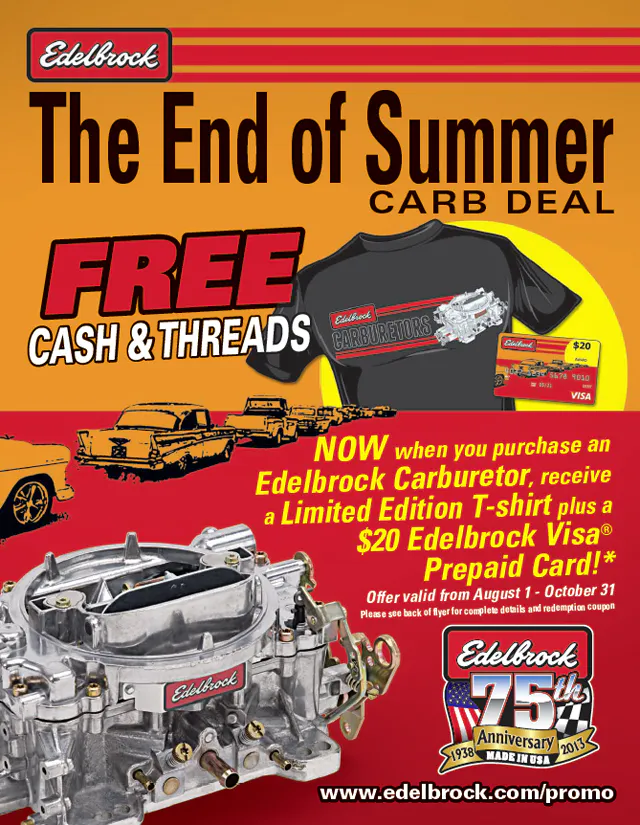 Edelbrock is excited to announce its “End of Summer Carburetor Deal” consumer promotion. Participating consumers can receive a free limited edition T-shirt and Visa prepaid card when they purchase a new Edelbrock carburetor.