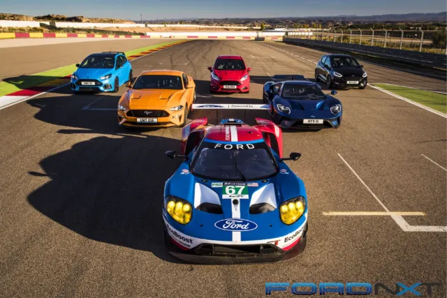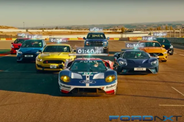 In a staggered start with the F-150 Raptor leading the way, eight Ford Chip Ganassi Racing Team drivers set out on a race for the finish line. Ryan Briscoe piloted the aforementioned pickup, while Dirk Müller drove a 1.6-liter Fiesta ST; Harry Tickenell drove the new, 1.5-liter Fiesta ST; Richard Westbrock drove the Focus RS; Stefan Mücke drove the 2018 Mustang GT; Joey Hand drove the Shelby GT350R; Olivier Pla drove the street Ford GT; and Andy Priaulx piloted the Ford GT race car, which started last for obvious reasons.