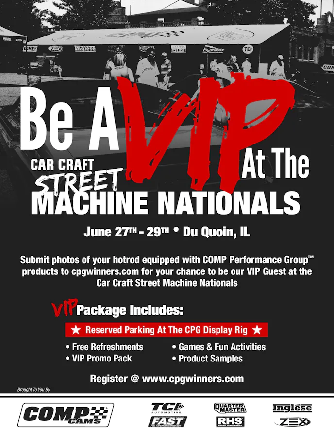 Every June thousands of muscle car and performance fans head to southern Illinois or to St Paul, MN in June and July for the Car Craft Street Machine Nationals. This three day festival of performance cars and horsepower is sponsored heavily by Comp Performance Group. This year Comp wants to send someone to be their VIP for either of the events which will be held June 27-29 in Du Quoin, IL and July 18-20 in St Paul, MN.