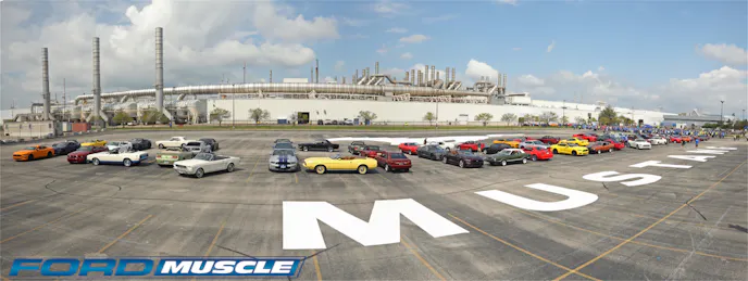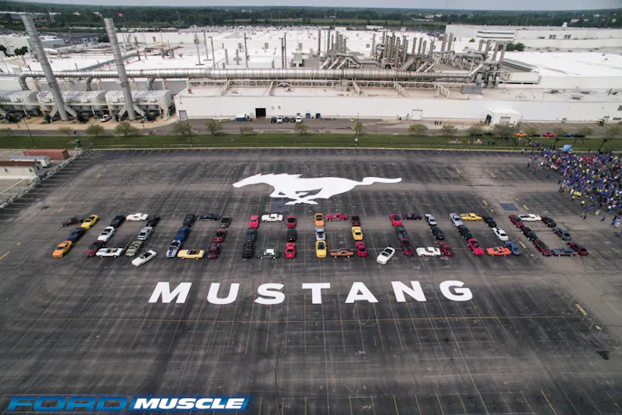 Today, with much deserved pomp and circumstance, Ford rolled the 10 millionth example of its Mustang off the production line at the Flat Rock Assembly Plant. That is a lot of cars. In fact, if you lined them all up bumper-to-bumper they could circle the globe with 1,200 miles to spare. To mark this occasion, the company gathered one of each model year at its World Headquarters and paraded to the Flat Rock Assembly Plant to join the milestone Mustang.
