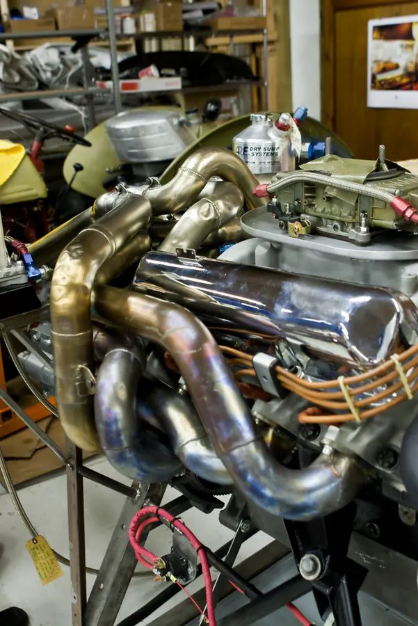 The up-and-over header design was necessary to fit the monster dry-sump 427 side-oiler between the framerails.