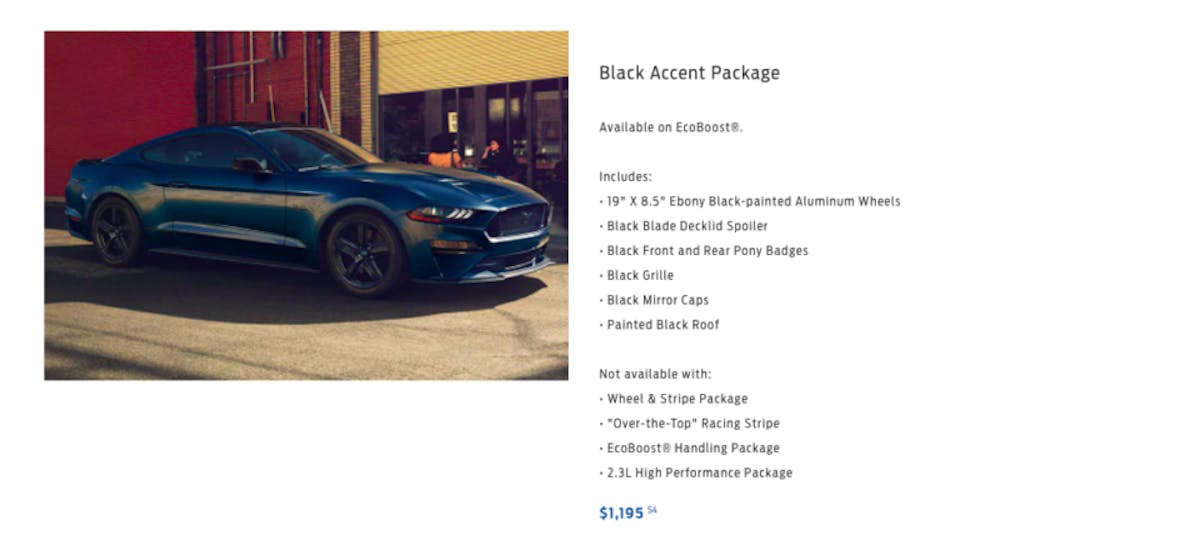 “Black pony badges and black-painted aluminum wheels,” the company said. “Our signature Mustang Black Accent Package needs a signature name to match.”