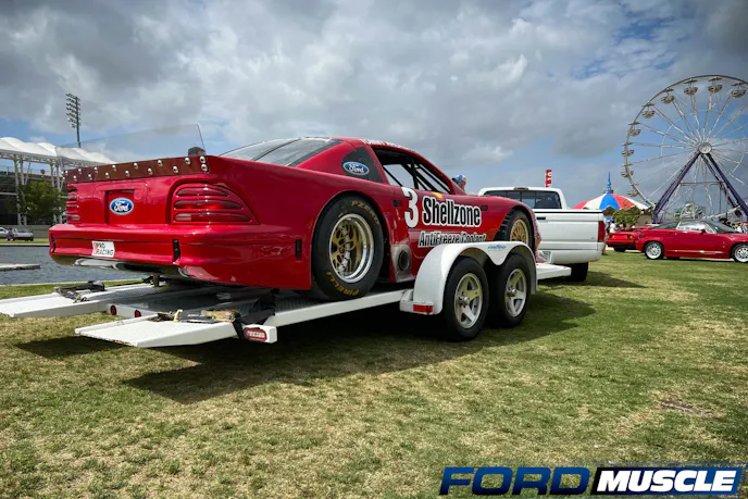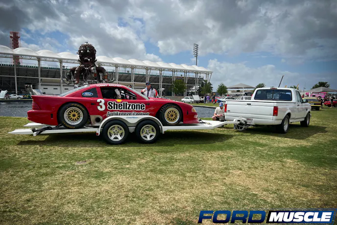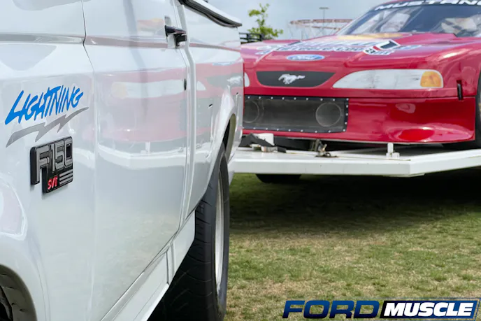 As you may know, your Ford Muscle editor is a huge Ford Lightning fan, owning one of each generation. So, there is always the chance of my eyes gazing towards my beloved single-cab performance truck when I’m attending shows. If it is white in color, then you have my undivided attention. While in their heyday these trucks were used as race vehicles or race team support trucks, they’ve since become a collector piece and oftentimes find themselves loaded with lawn chairs and coolers rather than drag slicks and fuel jugs. So, you can imagine my excitement seeing a white Ford Lightning with a color-matched trailer hooked up, and an SN95 race car sitting atop.