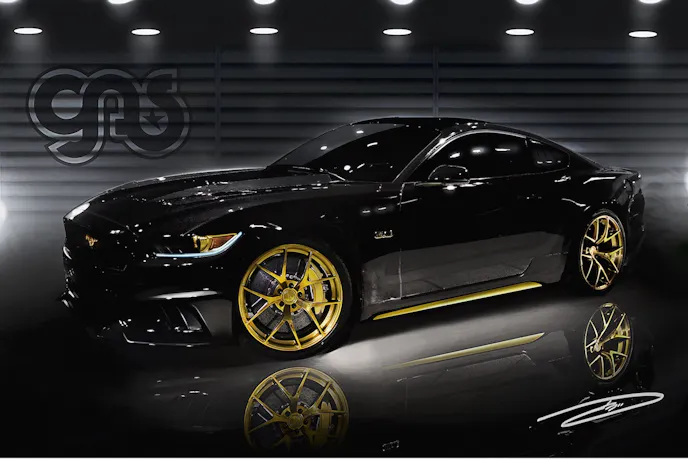 Inside, everything that is normally chrome or metallic has either been blacked-out or given the King Midas touch. The Recaro seats are covered with a fabric finished in black and gold, and the headliner is black microsuede. The exterior is finished in paint that may appear black, but on further inspection is filled with gold metallic flecks. The enhancements are far from just aesthetic as suspension components developed by Steeda were incorporated and an all-new exhaust from Magnaflow added some sound and power.