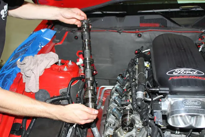 They weren’t finished, though – Step 2 dug a bit deeper into the engine, replacing the camshafts on both intake and exhaust valves with the M-6550-M50BINT and M-6550-M50BEXH pieces right from the Ford Racing Parts catalog. The intake camshaft has 13mm of lift and 263 degrees of duration, 1mm and 3 degrees more than the factory BOSS Camshafts. The exhaust cams carry 13mm lift and 290 degrees of duration, which is a substantial upfit from the factory 12mm/263 degree duration BOSS exhaust camshaft. Another calibration was developed to take advantage of the airflow improvements and maintain the Variable Camshaft Timing designs’ benefits, and the dyno was rolled to a 49 hp increase, with 15 ft-lbs of torque over the stock BOSS 302 designs.