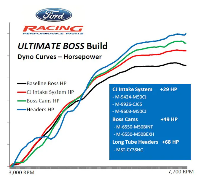 In a nod to the increased airflow, they then selected the Cobra Jet’s dual 65mm throttle body [PN M-9926-CJ65], which delivers substantially more air than the single 80mm piece found as original equipment on the BOSS and helps to fill the CJ intake manifold. The last item in this first step of the equation was to finish off the improved inlet tract with one of their cold air kits [PN M-9603-M50CJ] and develop an engine calibration to work with the improved airflow. The end result on the dyno was 29 additional horsepower and 10 foot-pounds of torque.