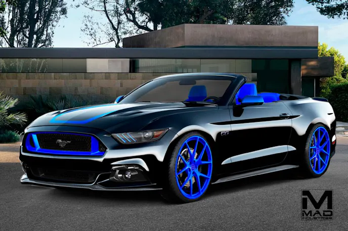 Mad Industries (MI) also built a sexy custom Mustang convertible, but MI opted for the V8 GT version with, surprise surprise, a supercharger on top. Making 725 horsepower, it’s no slouch compared to the competition, though it’s the striking Pure Black and Brilliant Blue paint scheme that really caught our eyes. The blue forged 21-inch wheels align well with the custom blue leather interior, which is accented by suede as well. A custom grille, mirrors, and hood art really tie this Mustang together as a real looker, even if blue-and-black might not be everybody’s cup-o-tea.