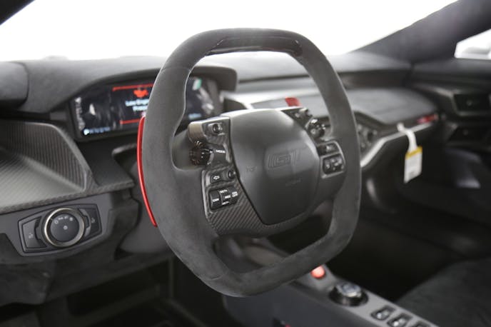 Core to this high-performance diet is nixing the creature comforts, including the air conditioning, radio and speakers, stowage bins and even the cupholders! Ford Performance goes further by installing a lightweight, vented Perspex acrylic engine hatch cover with a manual latch and carbon fiber prop rod. It also features a thinner, Gorilla glass bulkhead window to shave more weight.