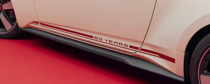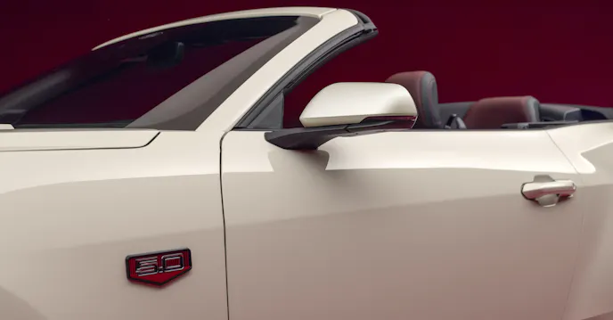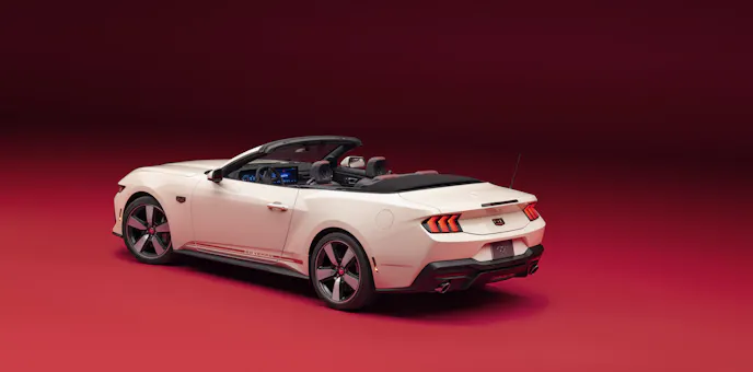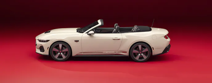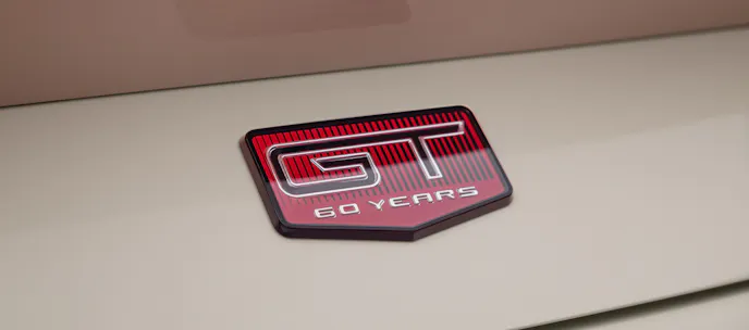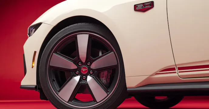 Lavished with 60th Anniversary badges and Iconic Silver or Vermillion Red graphics that echo the style of the original Mustang’s rocker panels, the 60th Anniversary 2025 Mustang rides on 20-inch Dark Gravity Gray wheels with bright-machined details and Vermillion Red, retro-themed aluminum center caps.
