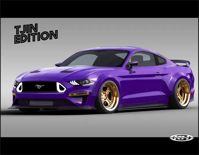 “This EcoBoost-powered 2018 Mustang by TJIN Edition manages to shout even when parked with hypnotic Electric Purple paint combined with rivet style custom bodywork and RTR parts,” says Ford. “An adjustable air suspension provides a slammed look when desired while still showcasing the Forgeline center-lock 20s wheels. Putting some serious beast in the EcoBoost comes courtesy of a turbo kit from Full-Race with upgrades by Borg-Warner.”