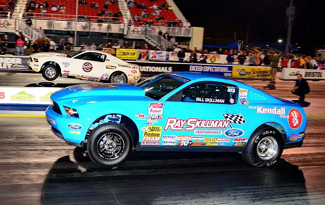 Skillman drove the blue Mustang of his son, Bill, in the race but was joined in competition by his grandson, Drew, in a white Cobra Jet team car which qualified second in the field behind performance standout Holbrook, whose Michigan-based Varsity Ford-sponsored Mustang again led all qualifiers with the quickest and fastest run of the event by accelerating to 118.98 miles per hour in just 5.82 seconds. Drew Skillman lost in the semi-finals after the closest race in series history, clocking 5.87 seconds at 118.53 mph to Butner’s slightly quicker 5.86/117.39 with only 8.31 feet separating the two Fords at the finish line. The SuperCar Showdown features open competition among production vehicles from all automobile manufacturers worldwide with engines, chassis and even tires remaining in factory trim.