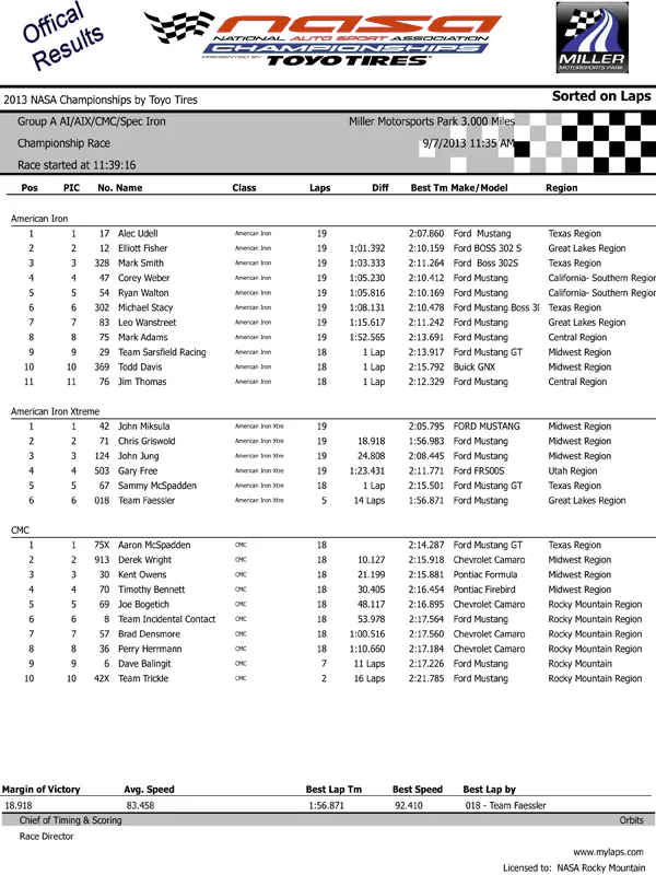 In CMC Aaron McSpadden drove his No. 75 Ford Mustang to the championship win by taking an early lead and holding it till the end over a class that mainly consisted of GM entries. McSpadden had the measure of the field all weekend. It was a great weekend to be a Ford fan, and we’ve posted the full results below.