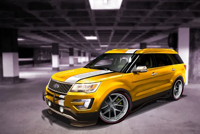 Last but not least is the “not” Mellow Yellow Explorer Concept that comes equipped most prominently with an impossible-to-ignore PPG yellow paintjob. Throaty Flowmaster exhaust gives it a burlier sound, Eibach lowering springs drop things down to street level, and it rides on B-Forged 20-inch modular wheels that perfectly fill the flared fenders.