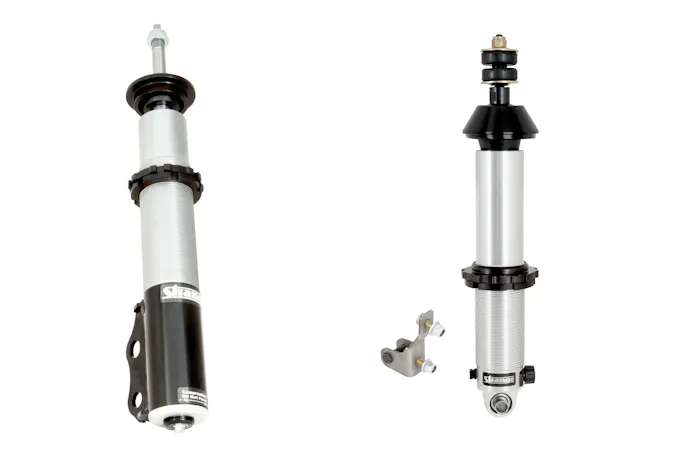 Both the shocks and struts are coilover designs making them an integral component of the car’s overall suspension; rear shocks are aluminum bodied while the struts are made of steel (since they’re part of the front suspension and therefore get lots of side load in use), and have multiple external adjustments for compression and extension with a wide variety of Hyperco spring rates for a variety of vehicle weights and combinations. They also carry the pedigree of Strange, which is saying something.