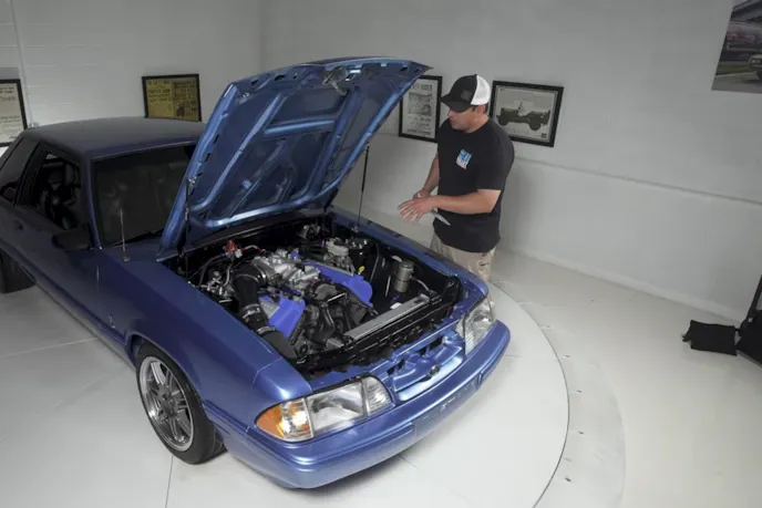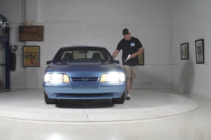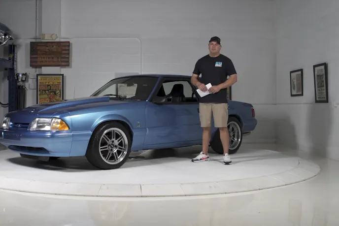 He then detailed its origins: “This was originally a red four-cylinder Fox-body. The only thing that’s original now are the seat brackets.” A fresh coat of Bimini Blue paint now covers the exterior.