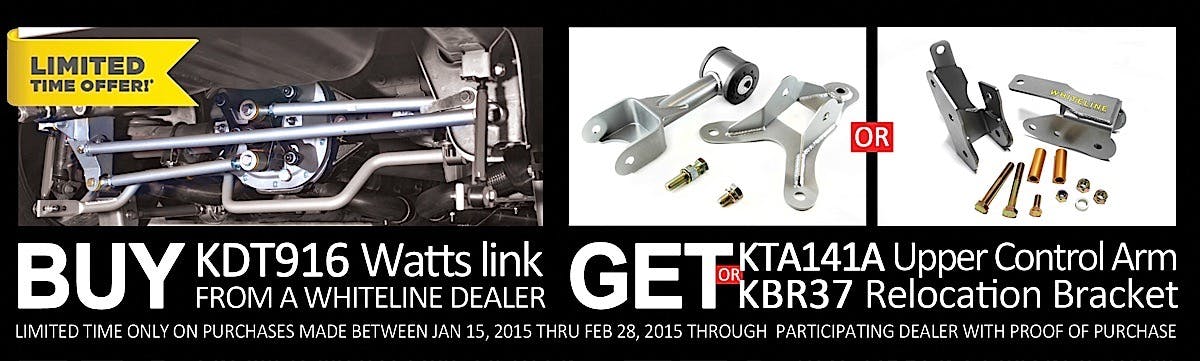 Right now Whiteline is running their Start Strong Finish Stronger promotion with their Mustang Watts link system. From January 15 through February 28, when you buy the Watts link system for your S197 Mustang from Whiteline, you can submit a form to get your choice of either a free upper control arm kit with bracket, or a free rear lower control arm mounting bracket kit.