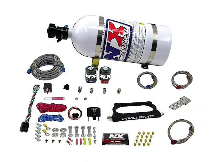The Nitrous Express GT 500 System features a billet nitrous plate that fits between the throttle body and intake making installation quick, simple, and attractive.  The system includes aluminum and carbon fiber solenoids, for ultimate performance and weight savings.