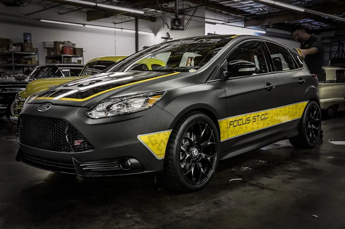 We’d previously only seen the car in artwork released by Goodguys, and last month we were given details on all the speed parts that were installed as well. This week the company released the before and after photos of the wrap that was done at PRO Wraps last week. What started out as a solid black Focus ST is now matte black with yellow graphics, designed by the Goodguys design/art team.