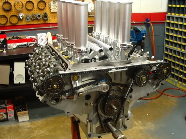 Keith Craft CNC machined the Bill Coon heads to its specs, adding Ferrea 2.350/1.750 valves, PAC beehive springs and T&D Machine rockers. Comp Cams custom grinds the two cams for KCPE, and the shop will use either Pond or Coon chain drives. On top sits a Hilborn 8-stack EFI manifold fitted with FAST injectors and controlled by a FAST ECU. Most of the hardware and hard-to-find specialty parts for the SOHC engine come from Precision Oil Pumps. MSD handles the ignition.
