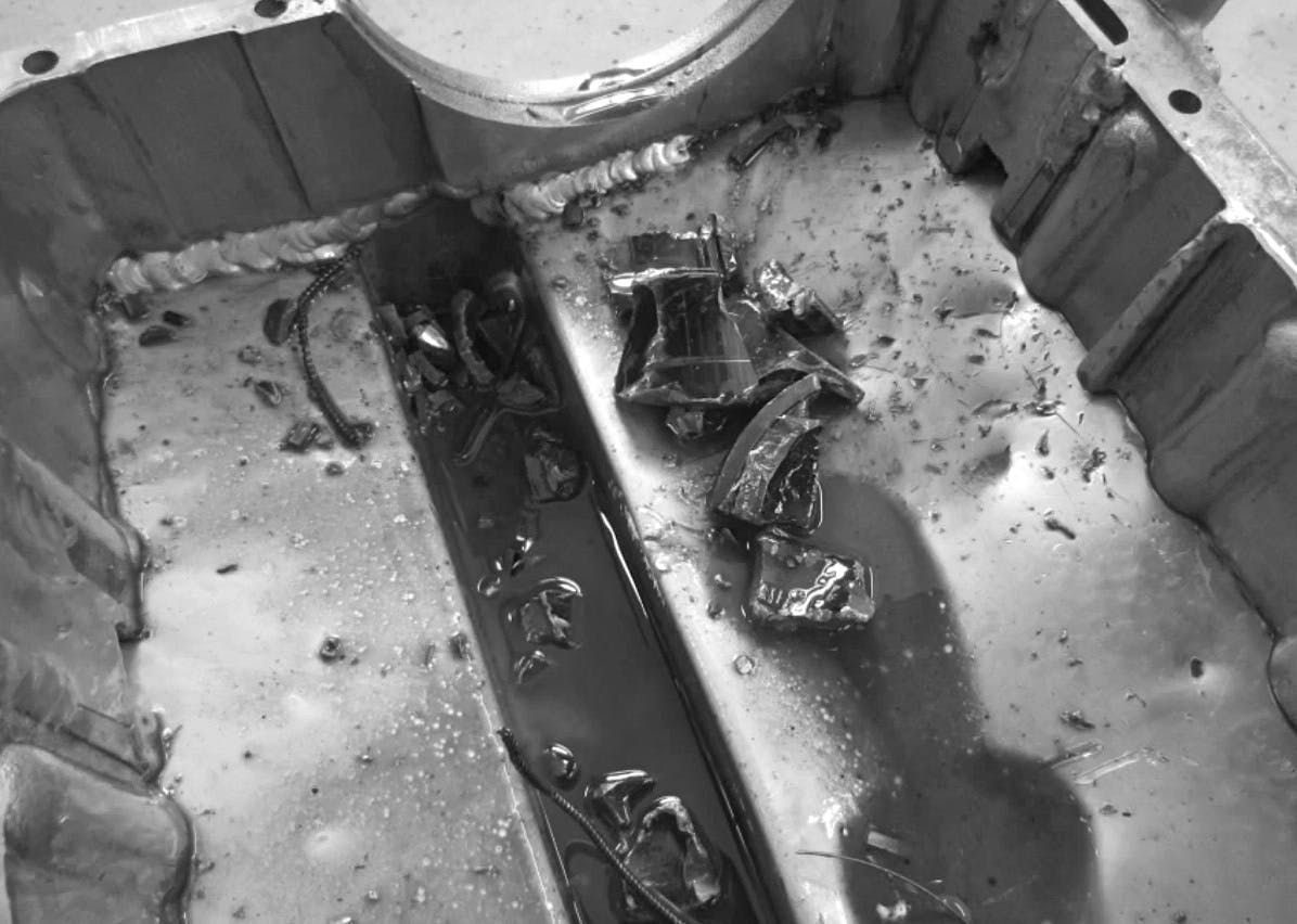 After a few painful dyno pulls, something inside the engine decides to retire. The pan is pulled and there’s plenty of shrapnel available for the postmortem analysis.