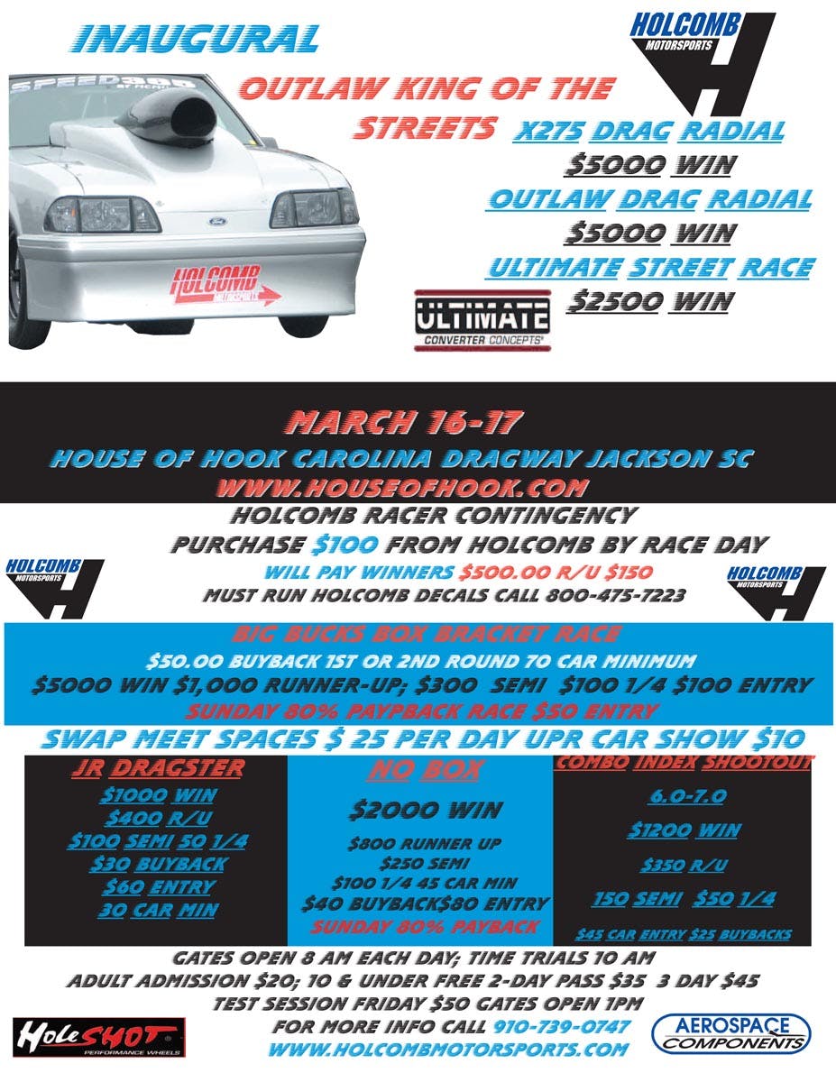 The gang at Holcomb Motorsports has been putting on races forever – their Civil Wars events pit North versus South and have been going on at the Rockingham Dragway in North Carolina for years now. They’ve decided to hold another race this year in addition to the Civil Wars, dubbed the Outlaw King Of The Streets, to be held over the weekend of March 16-17, 2013 at the Carolina Dragway, better known as the House Of Hook.