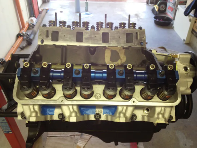 Valvetrain consists of Harland Sharp heavy duty rocker stands and Precision Oil Pumps‘ billet rocker stands, heavy duty oil pump shaft, billet spacers, and rocker stand studs along with Sealed Power roller-tip rocker arms. Precision also supplied the oil restrictors to the rocker shafts to better keep the oil under control at the top of the engine.