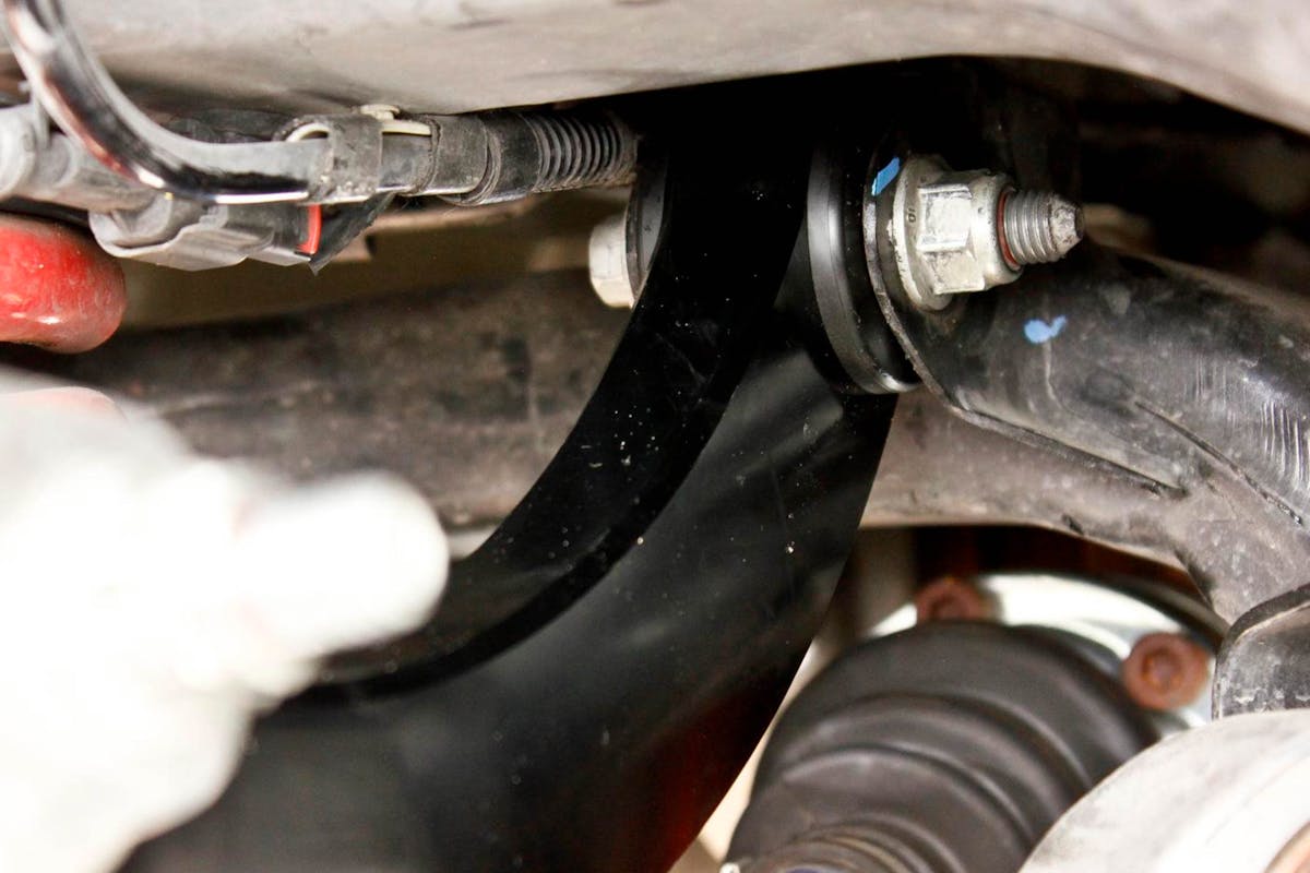 The OEM control arms are non-adjustable and when the vehicle is lowered the negative camber causes the wheel to become tucked into the wheel wells. This negative camber will cause premature tire wear and create a smaller contact patch, something no racer wants. To alleviate this you could purchase a set of adjustable control arms to bring it back in spec, but this also created a potential weak spot if the tie rod on the new control arms were to fail. It also added yet another variable to the alignment.