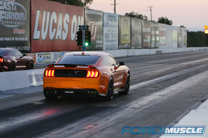 After a few hours commute to Irwindale Speedway (in the Shelby), the very first pass was a spinfest and a wasted run. After a few oildowns and crashes, we wouldn’t have too many more opportunities. We decided to throw a hail mary and air down the tires to 24psi. Using the automatic shifting feature in Sport mode, the GT500 managed to ease out of the hole with a 1.89 sixty-foot on its way to cross the eighth-mile marker at 7.68 at 98.94mph. On the second shift, the GT500 encountered some wheelhop that triggered torque management, which took a bit of time to ramp the timing back into the 5.2L (hindering the run).
