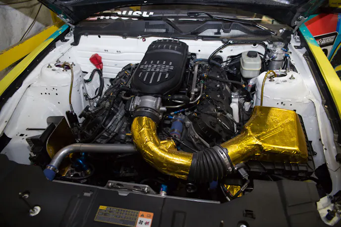 Said to have upgrades invested into it that exceed $300,000, this Boss 302S is powered by a Roush Yates-prepared Ford 5.0 motor with a dry sump oil system. It breathes through a specially tuned Kooks exhaust system and routes the power through a Ford Racing M-7003-BOSSR1 Tremec racing gearbox with a race-spec clutch, which then sends the grunt back to a Truetrac differential. The ABS system is sourced from Bosch, while a PFC braking system handles the stopping duties. The car rides on light weight forged wheels wrapped in Pirelli slicks.