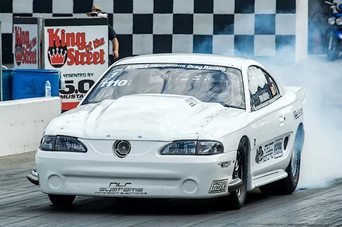 jk2The car does not sit legal for any sort of 275 radial class, as Kolivas was running it with the twin-turbo version of the same powerplant he runs with a single turbo in NMRA competition. “I haven’t even taken the valve covers off since NMRA, just switched up the turbo kit and ran the number at 3,300 pounds,” he says. The car relies on a Bennett Racing 427 cubic inch engine, Kooks exhaust, NLR Systems AMS2000 boost controller, and a Keith Neal Powerglide with Pro Torque converter. Wade Hopkins at Southern Speed Racing in Tupelo, Mississippi uses parts from Racecraft, Inc. to help Kolivas achieve the insane 1.11 short times.