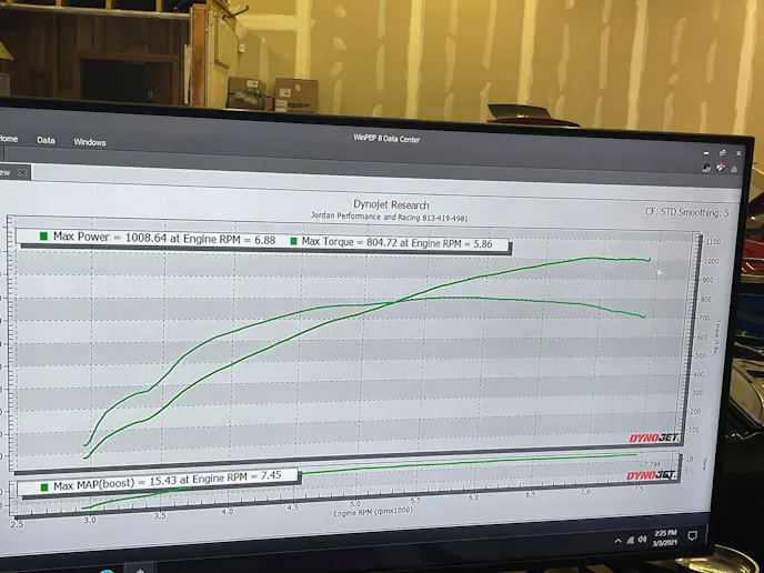 The package’s highlight is the well-known Hellion Power Systems Sleeper twin-turbo kit offered for 2018-up Mustangs, along with select other upgrades JPR installed to support the power level without going into overkill mode. These changes are based upon Jordan’s research and personal experience with this platform and have proven themselves over time. The turbo system features a pair of Hellion’s Sleeper 62mm billet wheel turbochargers and a massive 6-inch-core intercooler mounted in the nose, which catapulted the Mustang to record a massive 1,008 rear-wheel-horsepower figure as Jordan prepares the car for racing at the NMRA season opener.