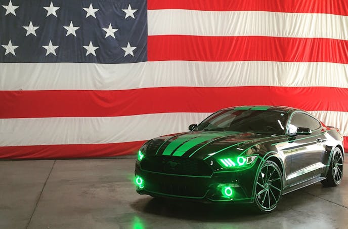 The Apex crew upgraded the headlights, added larger wheels and Nitto NT-555 tires and then applied a full 3M Sheer Luck vinyl wrap in green. The result is a Mustang that looks like it blasted right off the set of Tron. However, the appearance mods aren’t the only tweaks to this six-cylinder automatic. It also features hand controls, because of an unfortunate turn of events in Josh’s life.
