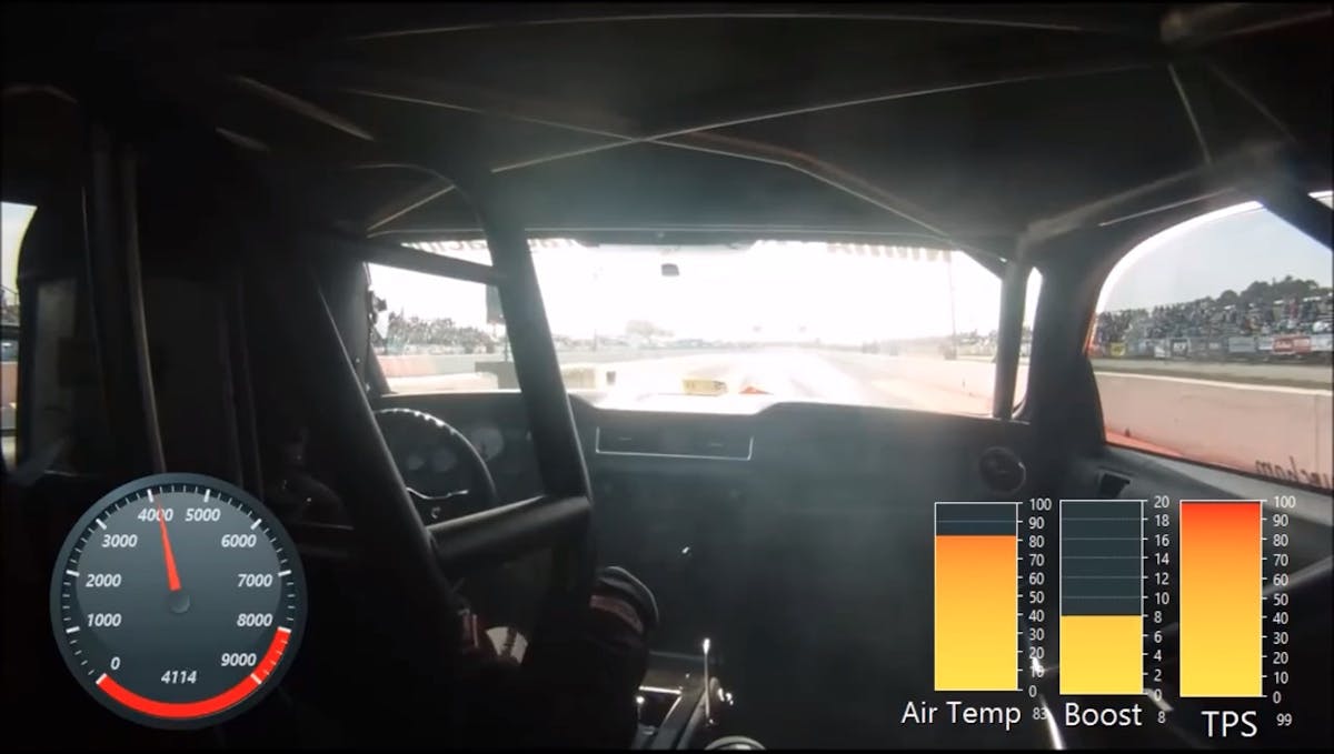 In round two, Burcham turned things up, and the car pulled the wheels not one, but four times. You can watch his car make the pass on the JPC Racing Facebook page. We were there to capture the nose pointed skyward on camera as well. Be sure to check out the video, it also shows AEM’s video overlay, which gives an overlay of specific engine parameters during the race. This is done using AEMdata analysis software.