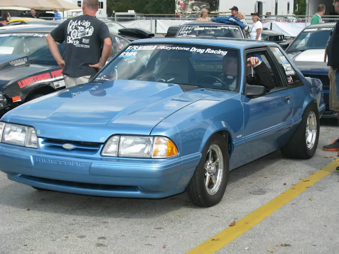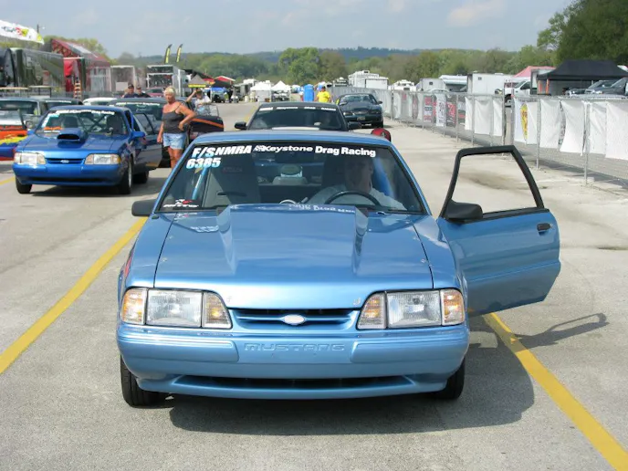 We’ve been hearing lots of news lately about the NMRA’s Coyote Stock class, with rumors of new cars and drivers just about every day. Coyote Stock is unique in the heads-up world in that the class requires a sealed, ‘spec’ engine and control pack that can be purchased through any Ford Racing Performance Parts dealer, then installed into your chassis that meets the class rules. The spec engine and locked-down rules package have been attracting a lot of attention from new and old racers alike, and one competitor we can introduce to you for 2013 is Georgia’s Kermit Buffington, a former NMRA Factory Stock racer who has decided to make the class change for 2013. His gorgeous blue notch is in the process of being refitted for the Coyote Stock class, and he’s anxious to get rolling into the 2013 season.
