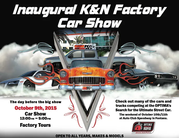Check your calendars because Friday, October 9th, the first K&N Factory Car Show will be held at the filter giant’s headquarters in Riverside, California. If you like cars there will be something there for you. This is an all makes and models event, so come out and see the over 50 cars from Optima’s Search for the Ultimate Street Car. Come and kick tires from 8:00am to 5:00pm. Muscle cars, hot rods, trucks, off-road vehicles, imports whatever you’re in to it’s likely to be there.