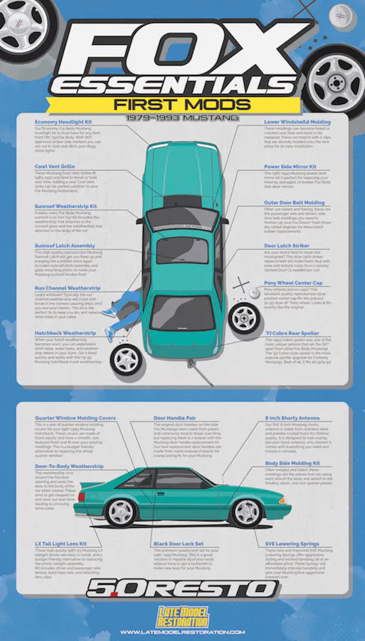 Whether you’re dealing with wind noise, water leaks, appearance issues, or just looking to make your Fox Mustang look, run, and perform better, Late Model Restoration has the answers, and this infographic is definitely something to reference the next time your Fox has a seemingly basic ailment.