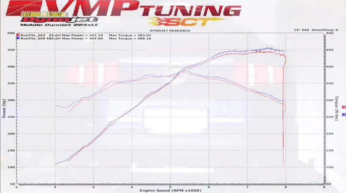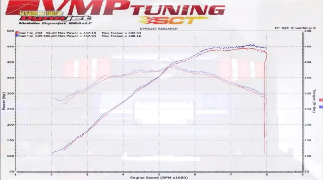 After install during a dyno session the XS sent 457 hp and 388 ft-lbs to the rear tires. In a market segment where we’re used to seeing blistering numbers on the dyno from a forced induction Coyote this may not sound like much. However, look at where the torque comes in, by 2,500 RPM the XS is already putting over 300 ft-lbs to the rear tires. Horsepower is above the 400 mark at 5,500 RPM, and flattens out from around 6,200 RPM all the way to the 8,000 RPM redline.