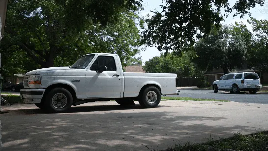 The exterior wasn’t in terrible shape, with a few dents and dings throughout. Surprisingly, the clear coat had somehow survived the brutal Texas sun. The inside was where the majority of the parts had been salvaged, leaving the steering wheel resembling a backlit keyboard missing a few keys. The seat covers were my only glimpse of hope, but nope, the condition under the covers matched the rest of the interior. A mix of black and Ford’s gray interior panels rounded it out.