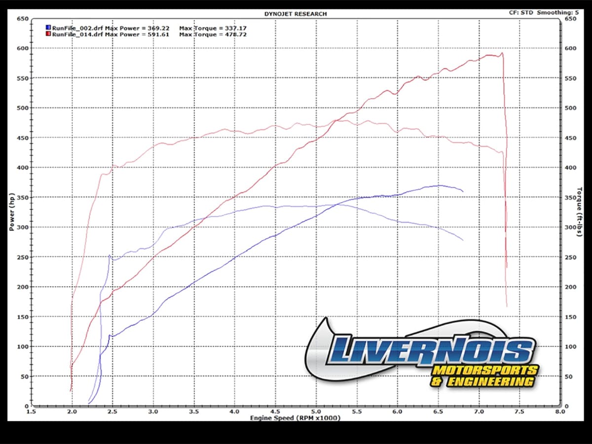 • 1-Year WarrantyPrior to the upgrades the 2015 Mustang laid down a respectable baseline of 369-horsepower and 337 lb-ft of torque with just a set of aftermarket mufflers. Not a bad place to start, but when there is the potential for triple-digit gains it is time to get wrenching. Fortunately, customers have the option to purchase the kit alone or can they opt to have it installed at Livernois Motorsports.