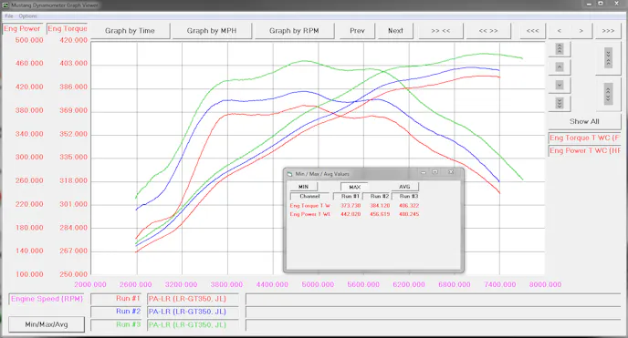 Lund’s GT350 dyno’d at 442.0 horsepower and 373.7 lb-ft of torque at the rear tires in completely stock trim, with a fuel tank full of 93 octane. “After a little tweaking with the calibration we picked up 14.5 hp and around 10 ft/lbs of torque, for 456.6 horsepower and 384.1 lb-ft of torque at the tires,” says Lund Racing’s Ken Bjonnes.
