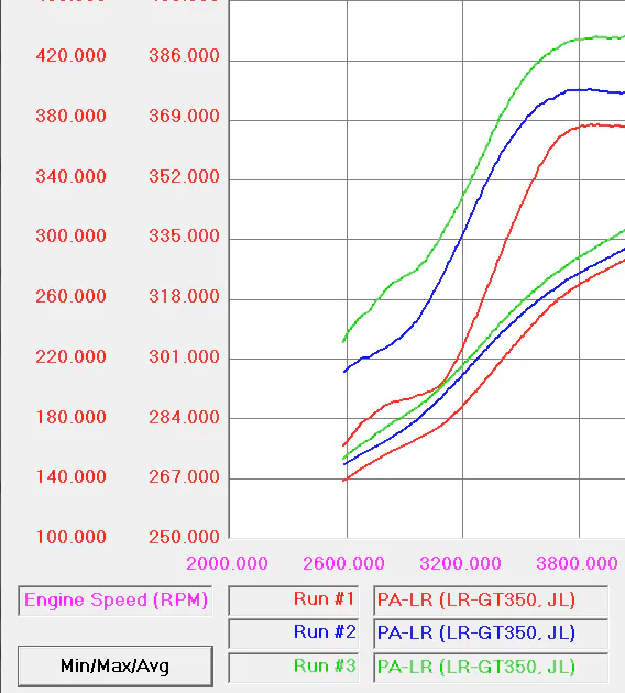 Lund says he focused a great deal on improving low end power, below the peak to improve the car’s response and drivability around town. “As always there’s room for improvement. One of the immediate things I noticed is that the low end is soft. This is probably something that Ford intended because it is a track car (road racing), but for putzing around on the street I’d like it to be a little more snappy down low so that was one of the first things I tried working on and you can see with our calibration on the graph around 2,500 to 3,200 rpm where we improved that some.”