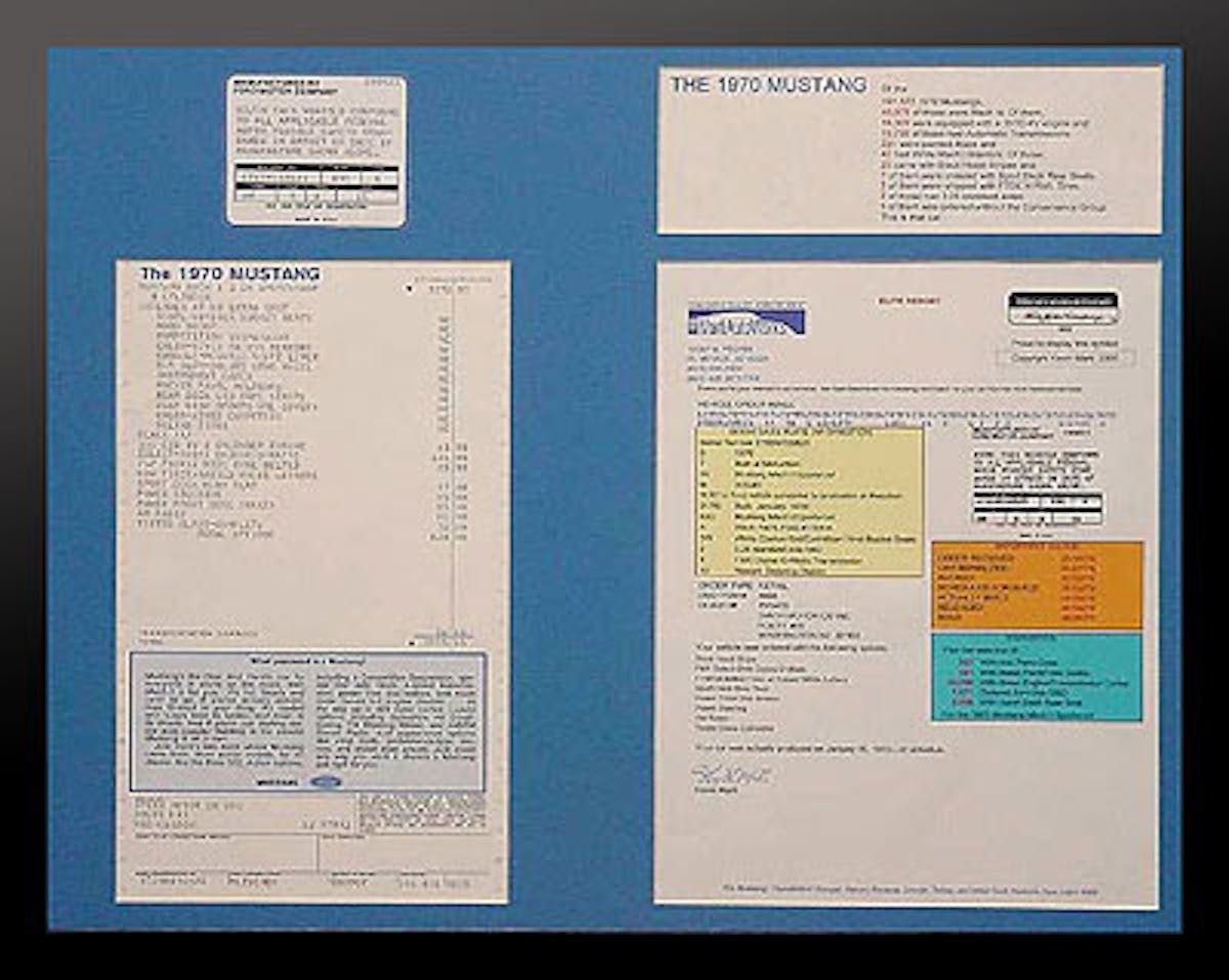 Individual reports are available based on a vehicle serial number and range in cost from $15 for a standard report, $40 for a Deluxe report, to $200 for the Elite report. The latter provides the complete factory option list and door data plate info and a reproduction of the door data plate. A reproduction of the window sticker and personalized production statistics that show how unique your car is provided, all mounted on a Ford blue matte board and installed in a 16″ x 20″ black frame.