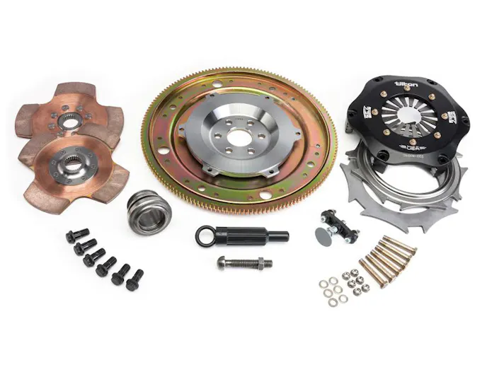 Lightweight Tilton clutches have been winning races and championships since 1972. Tilton’s design advantage is a clutch-and-flywheel assembly whose super-low “moment of inertia” (MOI) quickens acceleration, allows faster shifting, and improves braking and downshifting at corner entry. Multiple 7.25-inch-diameter discs greatly increase torque-holding capability over a typical 10.25-inch, single-disc Mustang clutch, without adversely affecting the MOI.
