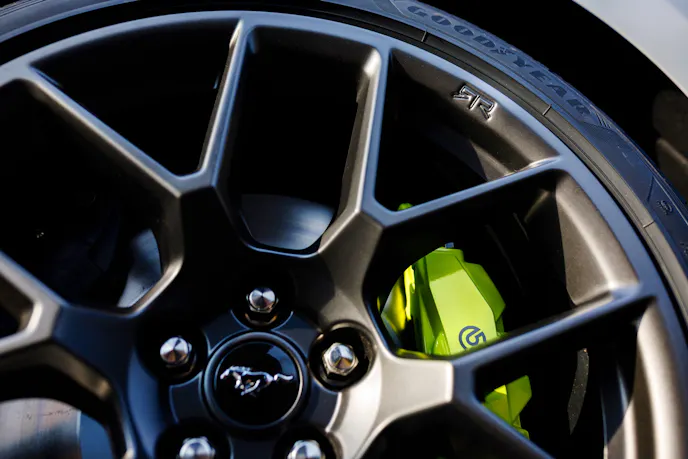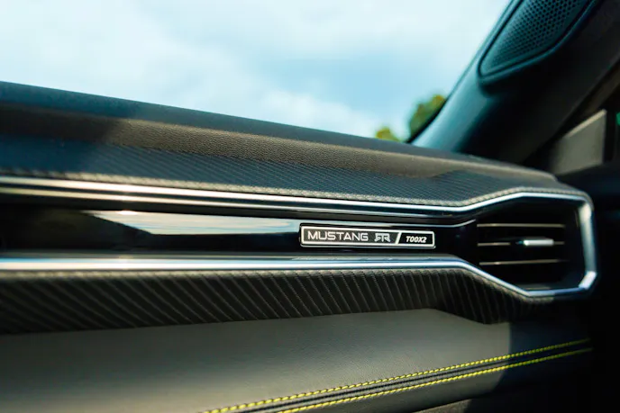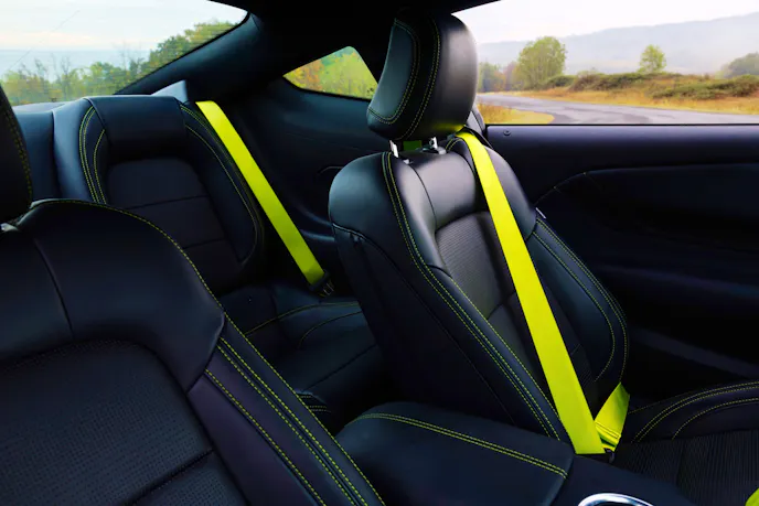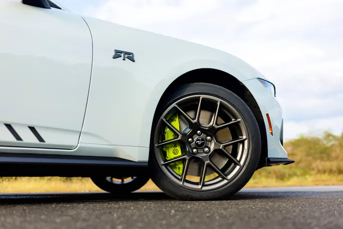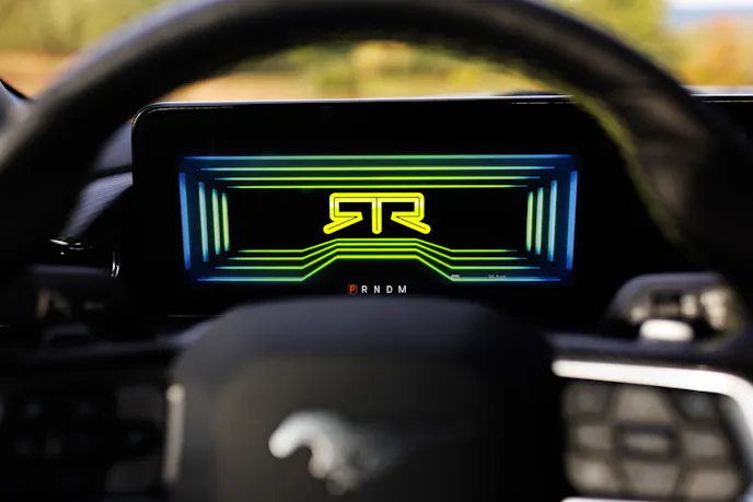 Every detail of this design gives this new model that edge. The RTR-specific look extends to a Mustang GT–style front fascia, RTR signature lit nostrils, and a custom grille with RTR badging. Tarnished Dark Anodized finishes appear on the pony emblem, mirror caps, and decklid spoiler, while Hyper Lime brake calipers peek out from behind 19×9.5-inch Tarnished Dark wheels with a 30-millimeter offset. Unique graphics adorn the hood, rockers, and quarter panels, and the optional Hyper Lime Exterior Package adds color-matched highlights and gradient graphics for those who want a bolder look in a factory funhaver.