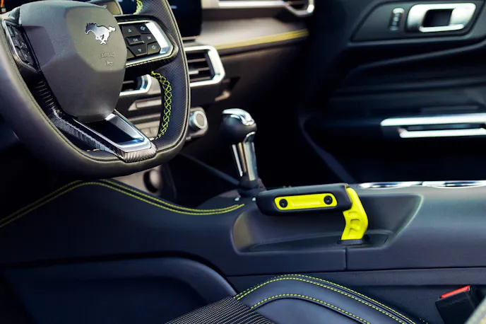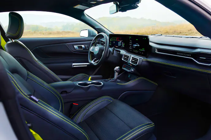 Inside, every trim level gets Hyper Lime stitching on the seats, dash, and door panels. The Drift Brake handle carries the same bright accent, while an RTR dash plaque and illuminated sill plates complete the package. When you open the door or start the car, RTR-specific animations play across the twin digital displays, offering a subtle reminder that this is no ordinary EcoBoost. For those who prefer a more understated look, a no-cost option replaces the Hyper Lime stitching and Drift Brake finish with standard black trim.