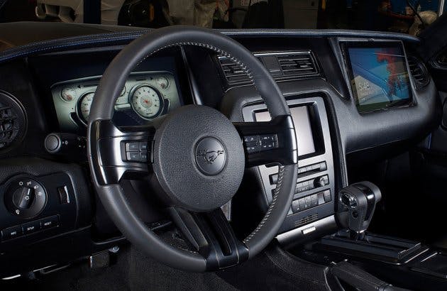 The touch-screen dashboard displays run the Windows 8 beta, called the consumer preview. The driver can swipe the screen to toggle between different dashboard skins that includes one that resembles the dash of a 1967 Mustang, as well as one that features the 2012 Mustang look and one that borrows the tile-based look of the new Windows 8 interface, dubbed Metro.